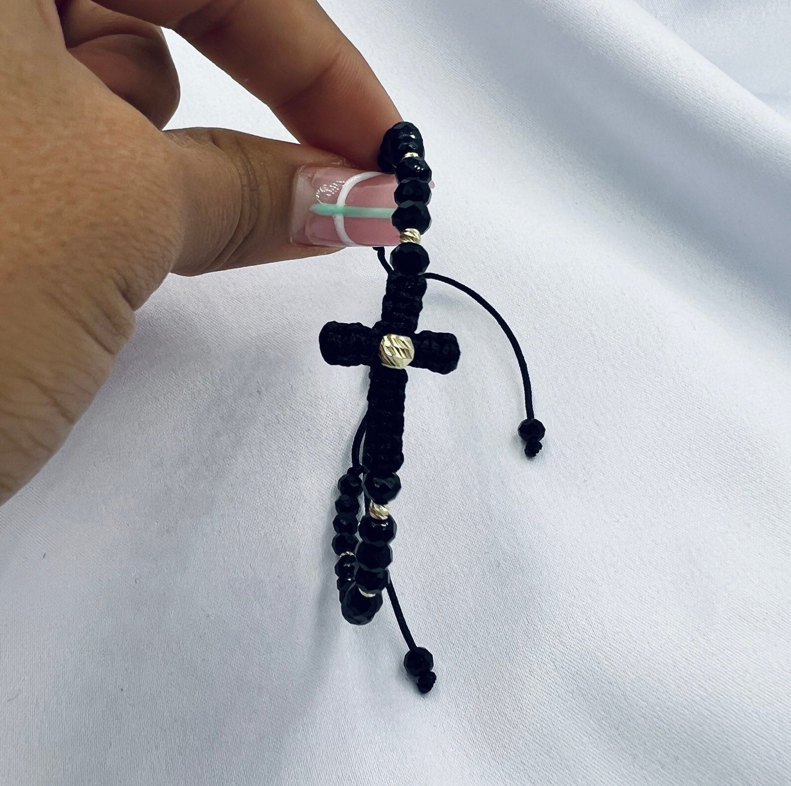 Brățară cu șnur împletit în formă de cruce, cristale strălucitoare și elemente din aur de 14K, 9 biluțe de diferite dimensiuni