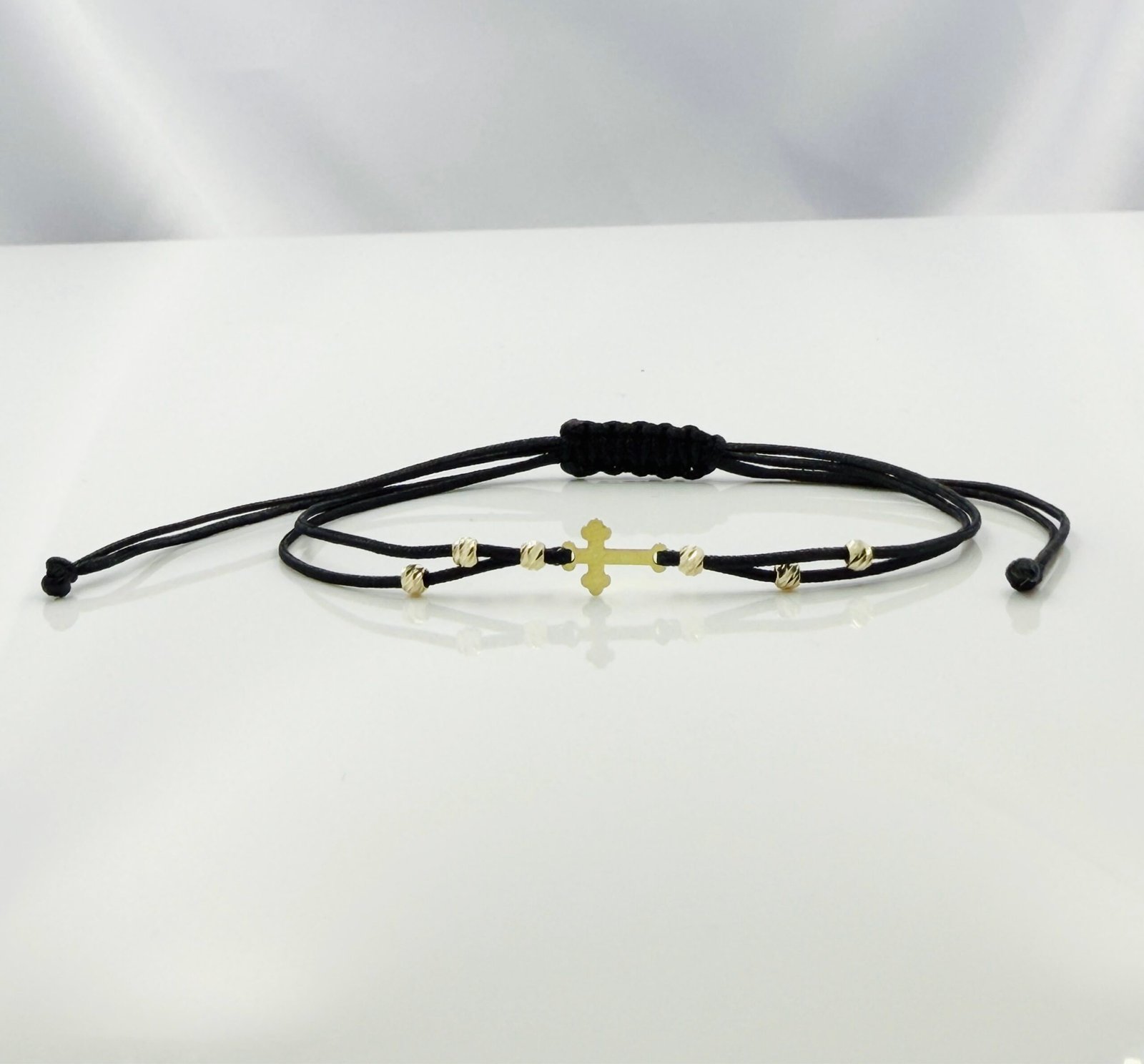 Brățară realizată cu șnur, link cruciuliță de 1cm și 6 biluțe de 2,5mm din aur 585 14K