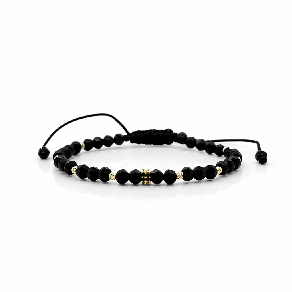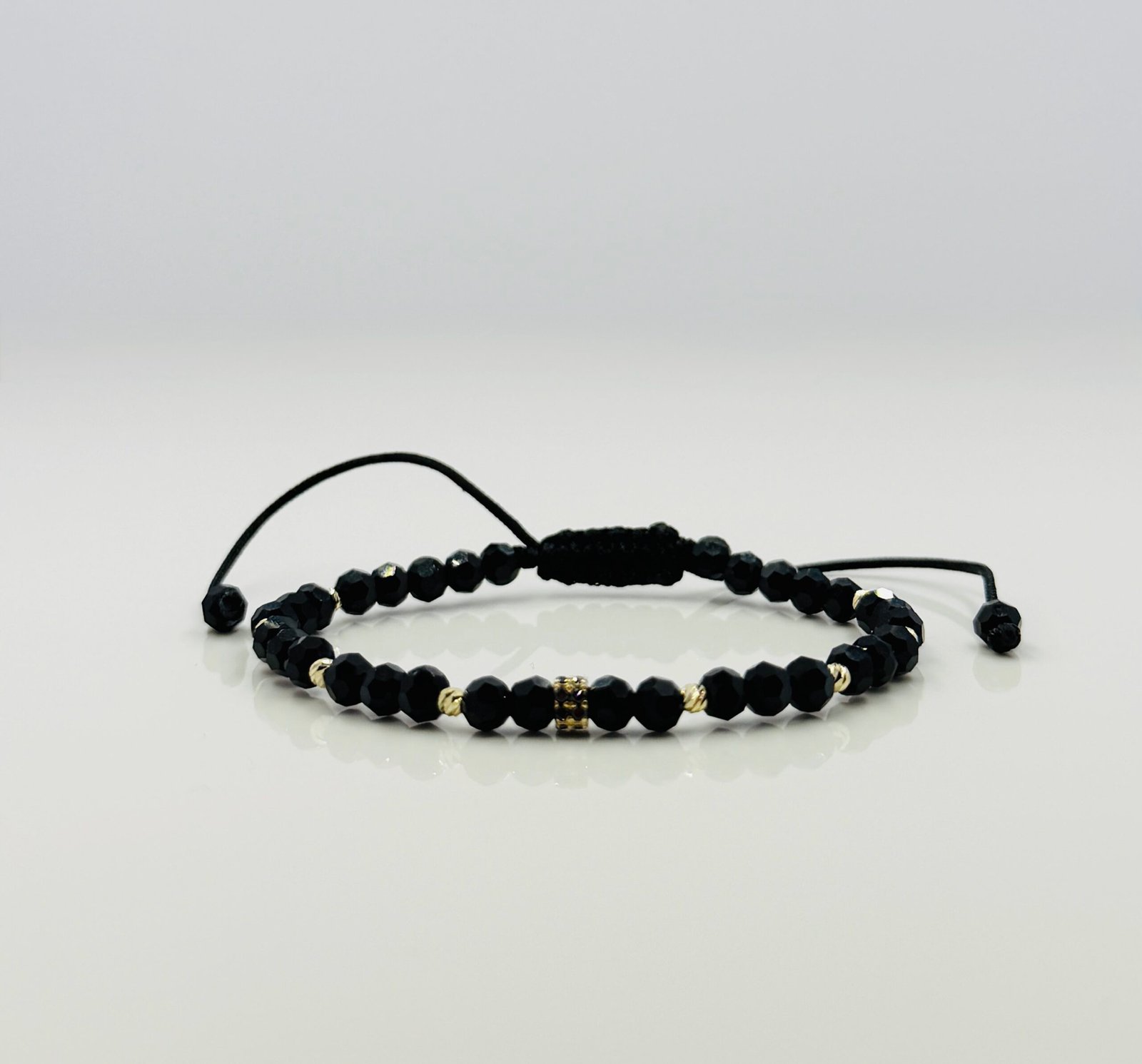 Brățară realizată cu șnur, charm cu pietricele negre, 8 biluțe de 2.5mm din aur 585 14K și cristale de 4mm