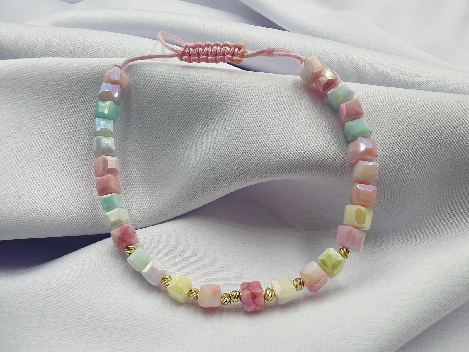 Brățară cu cristale pastel și 8 biluțe din aur de 14K
