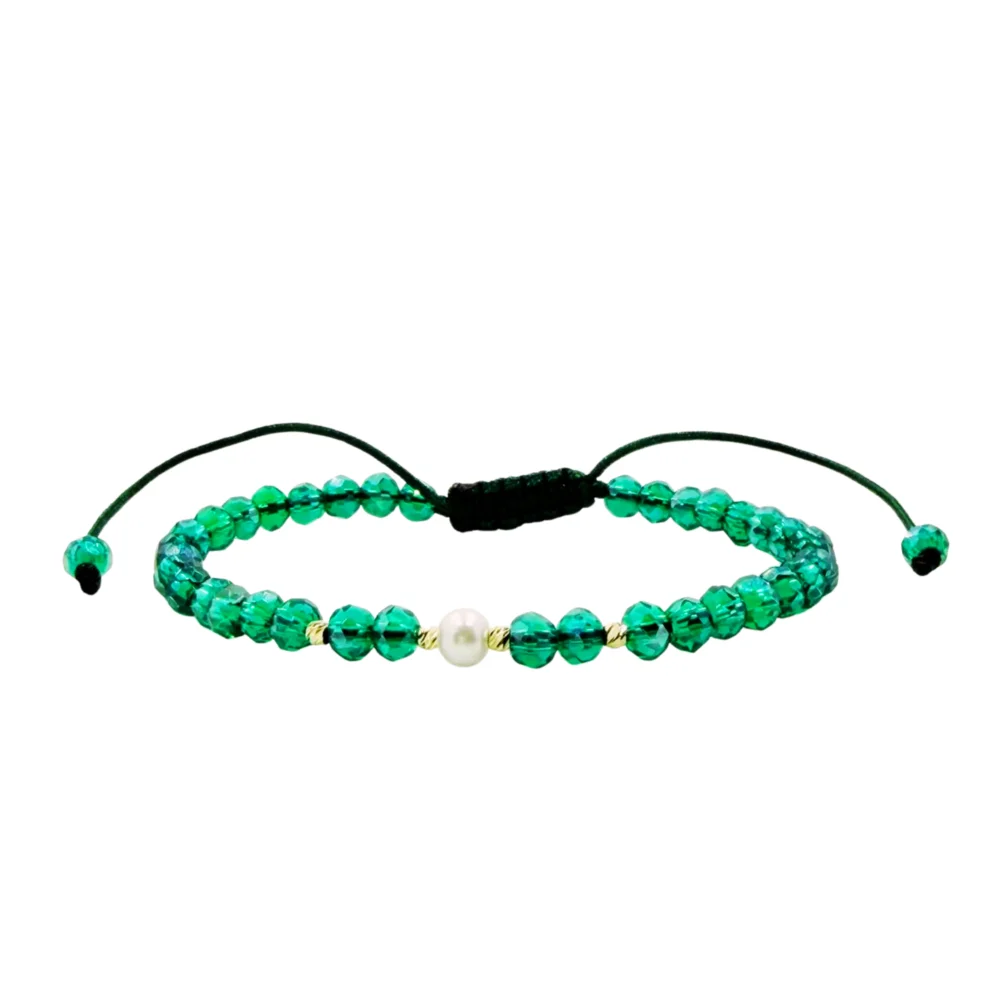 Această brățară sigur iti va atrage atentia, formata din cristale fațetate, perla si 4 biluțe striate din aur 585 14K de 2mm  este printre preferatele clienților noștri, având un design elegant și fiind ușor de purtat și asortat în diverse ținute vestimentare.