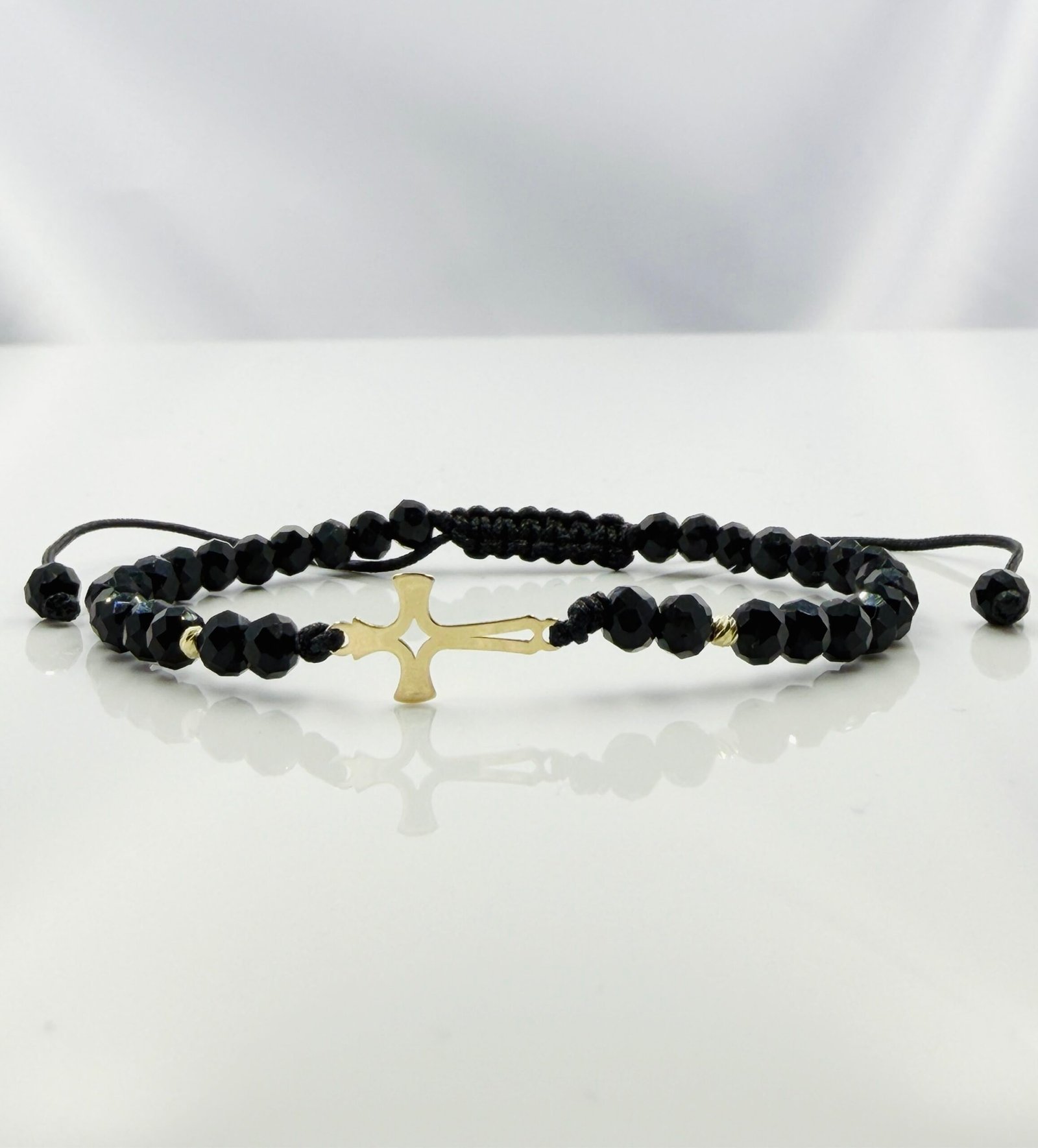 Această brățară cu cristale din sticla, biluțe striate din aur 585 14K si cruciulita de 1cm este printre preferatele clienților noștri, având un design elegant și fiind ușor de purtat și asortat în diverse ținute vestimentare.