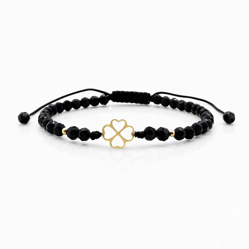 Această brățară cu cristale din sticla, biluțe striate din aur 585 14K si trifoi este printre preferatele clienților noștri, având un design elegant și fiind ușor de purtat și asortat în diverse ținute vestimentare.