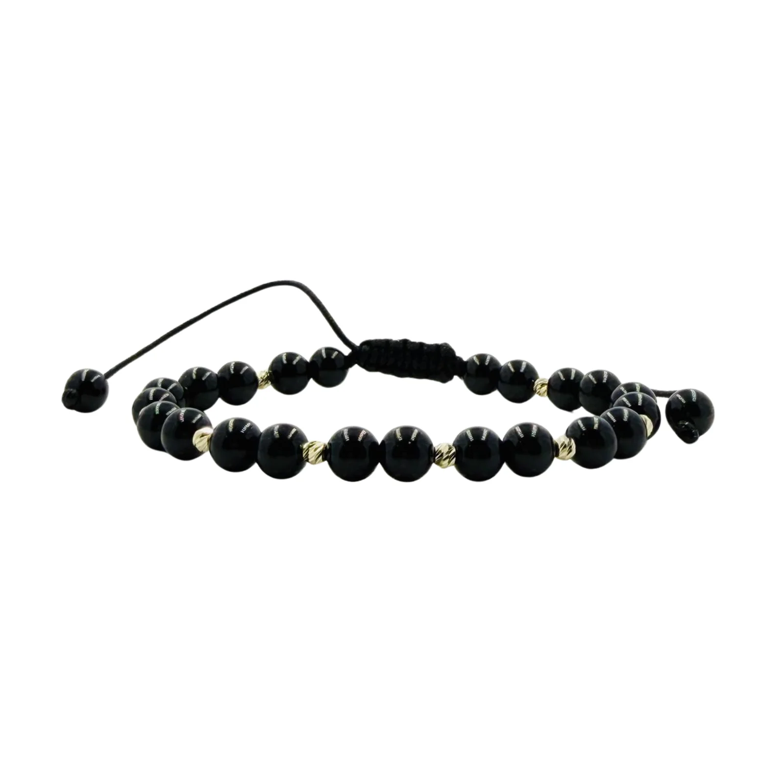 Brățară realizată cu șnur, 10 biluțe de 3mm din aur 585 14K și pietre semiprețioase onix, lucios de 6mm