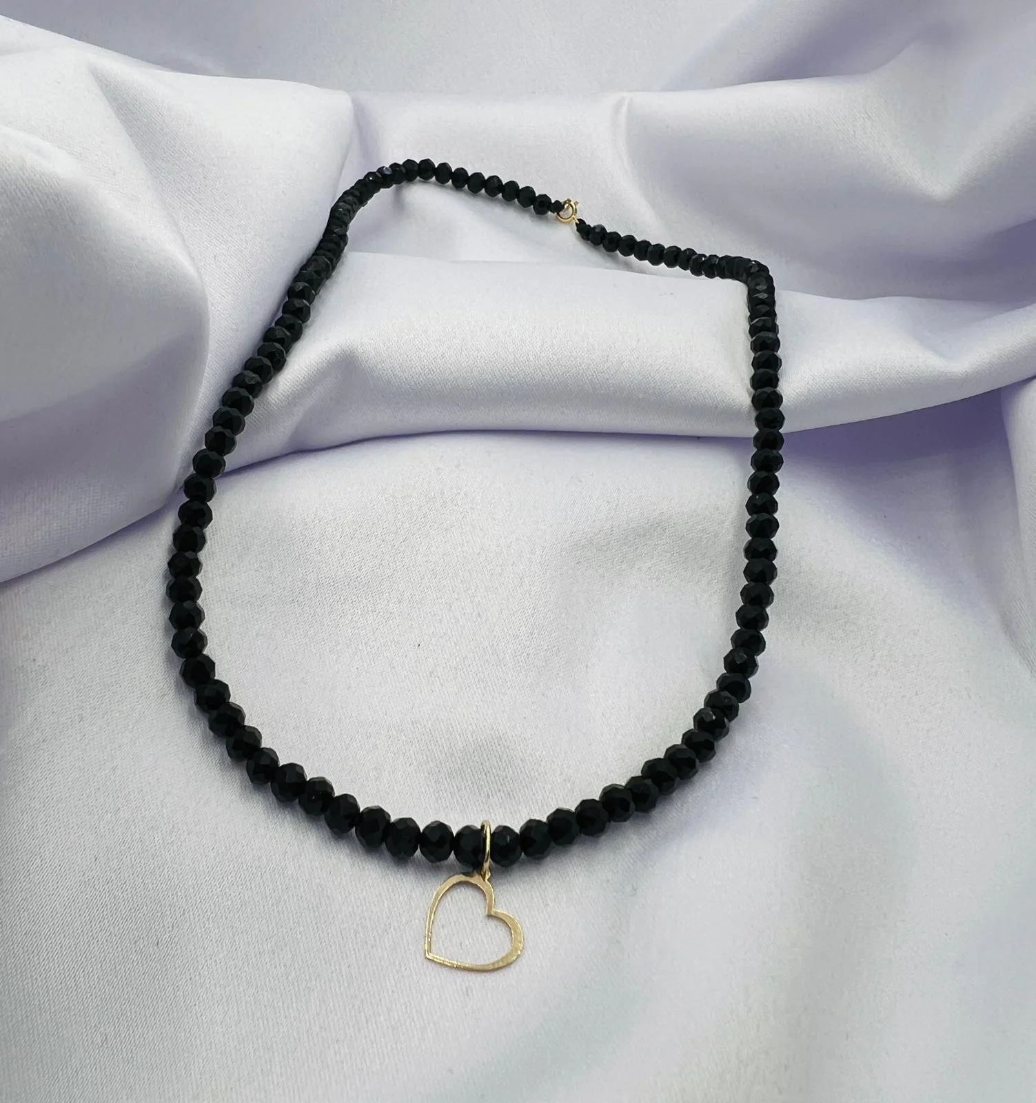 Colier cu cristale rotunde, pandantiv inima decupata si inchidere din aur 14K.
